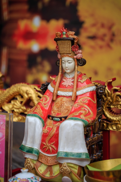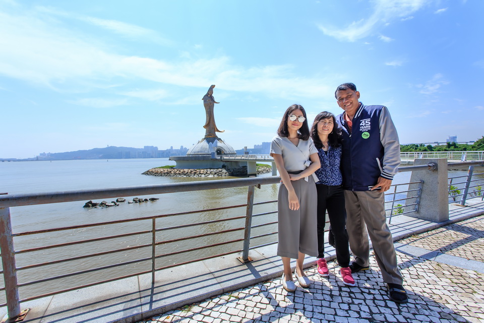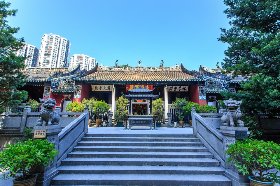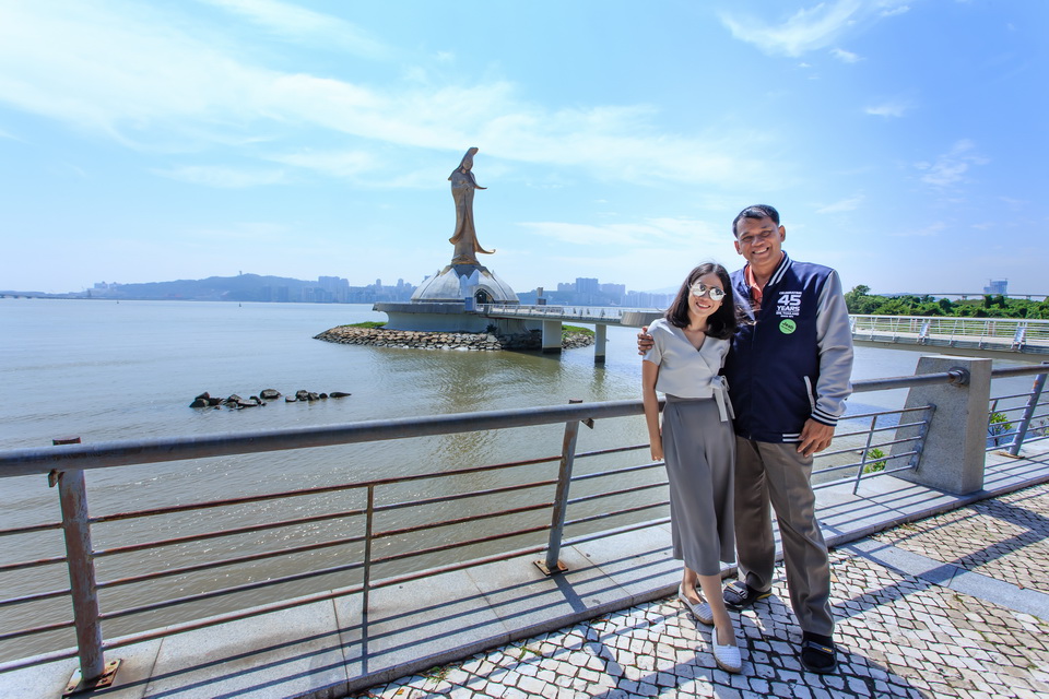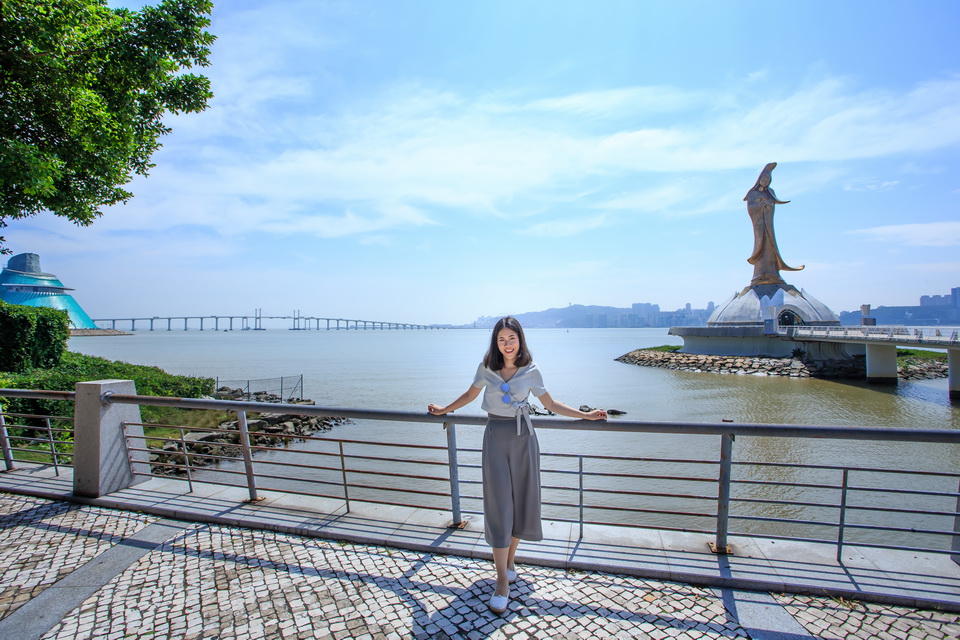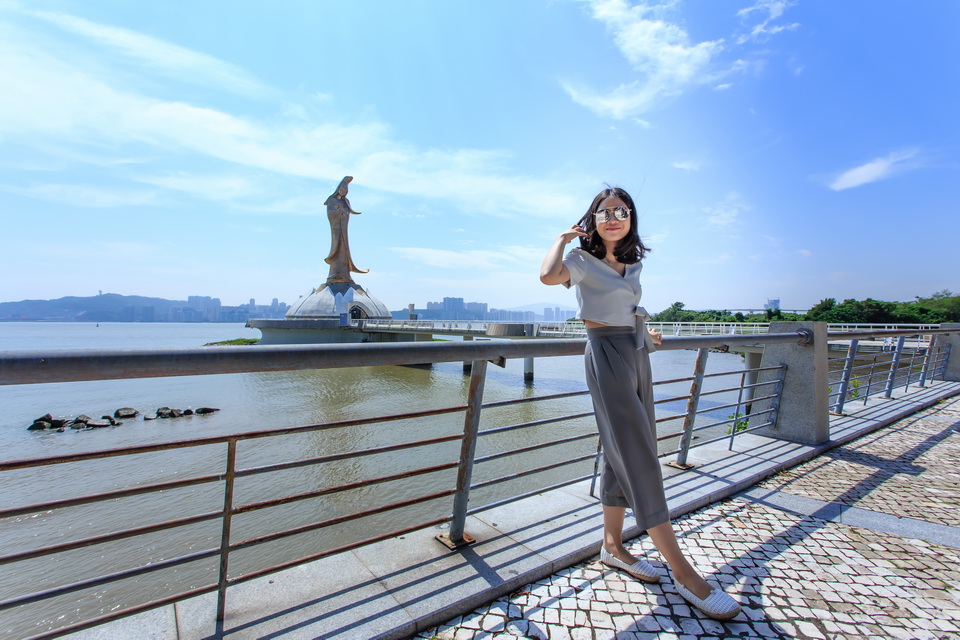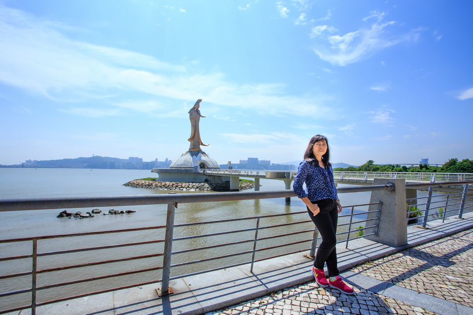 เจ้าแม่กวนอิมริมทะเลหรือเจ้าแม่กวนอิมปรางค์ทอง สร้างด้วยทองสัมฤทธิ์ทั้งองค์ ประดิษฐานอยู่บนฐานดอกบัว เจ้าแม่กวนอิมองค์นี้เป็นเจ้าแม่กวนอิมลูกครึ่ง คือปั้นเป็นองค์เจ้าแม่กวนอิม แต่กลับมีพระพักตร์เป็นหน้าพระแม่มารีย์ ที่เป็นเช่นนี้เพราะว่าเป็นเจ้าแม่กวนอิมที่โปรตุเกสตั้งใจสร้างขึ้นเพื่อเป็นอนุสรณ์ให้กับมาเก๊าในโอกาสที่ส่งมอบมาเก๊าคืนให้กับจีน |